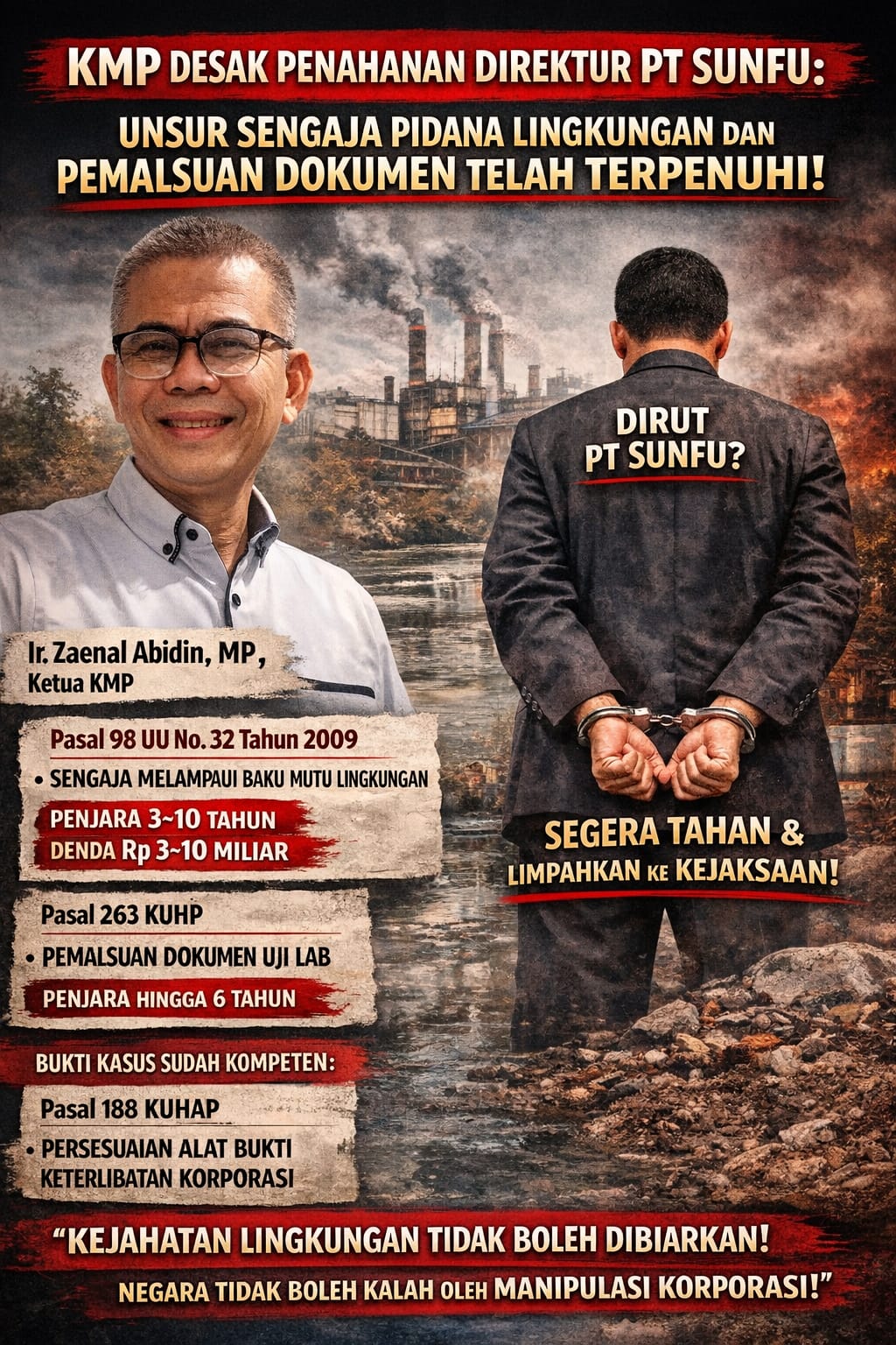 “Dengan telah terpenuhinya persesuaian alat bukti, kami mendesak agar Direktur PT SanFu Indonesia dan pihak-pihak yang terlibat segera ditetapkan sebagai tersangka, dilakukan penahanan, dan perkara ini segera dilimpahkan ke Kejaksaan untuk proses penuntutan,” tegas Ketua KMP.